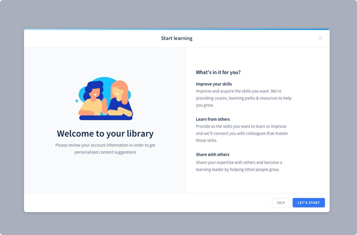First-time users are guided through a short wizard that personalises their library experience. Every step can be skipped and completed later.