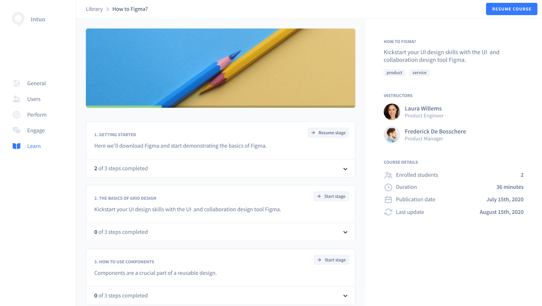 A full redesign of Intuo's Learning Management System, making it easier for employees to discover content, track progress and grow their skills.